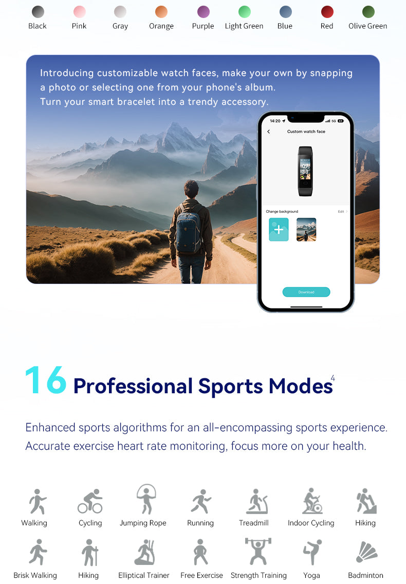 🏃Personalized Sports Tracking: Connect effortlessly with any Android 4.4+ or iOS 9.0+ device. Choose your favorite 4 from 16 sports modes, including running, cycling, and mountaineering, to personalize your fitness tracking right from the cardio smartwatch.
